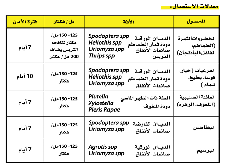 ملاحظات : يجب الالتزام بفترات الأمان أثناء القطاف، لا تستخدم المنتج على المحاصيل غير الواردة في الجدول.